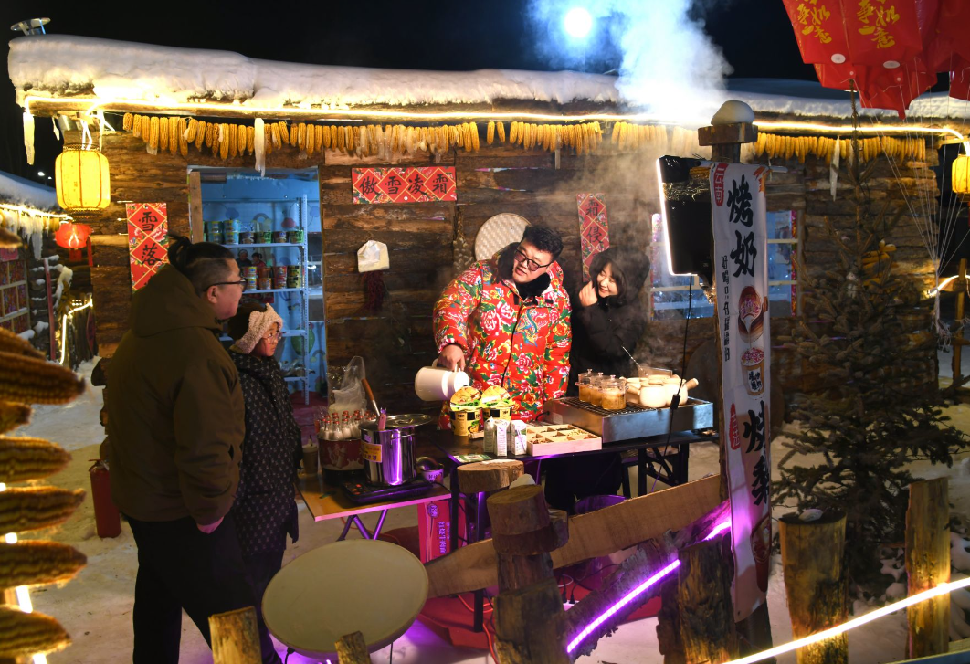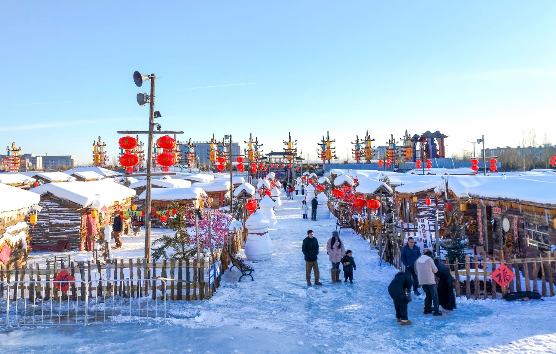 踏入雪鄉(xiāng)板塊,50個復(fù)刻北方傳統(tǒng)風(fēng)貌的院落集群映入眼簾,木柵欄上垂掛的紅燈籠與蓬松雪層相映成趣,屋檐下懸垂的雪舌、雪簾勾勒出童話般的輪廓。每個院落都藏著專屬打卡場景,推門而入可見家庭場景,窗外是皚皚白雪,屋內(nèi)飄著燒烤、火鍋和奶茶的醇厚香氣,瞬間驅(qū)散冬日寒意。游客穿梭其間,鈴鐺輕響,為這份雪鄉(xiāng)煙火氣增添了濃郁的民族風(fēng)情。